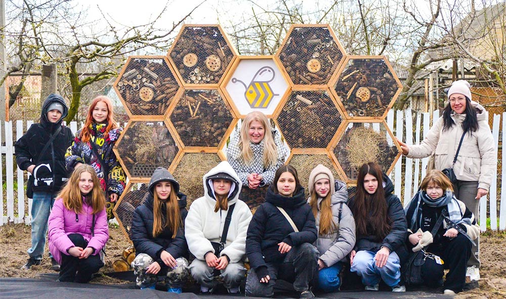 Children collected reeds, pine cones, bark, and other components to fill the future bee hotel. They assembled a structure consisting of 15 cells, filled it with natural materials, and installed it on the lyceum grounds. Subsequently, flowering plants were also planted to support osmia bees. Rainwater harvesting systems and drip irrigation were installed for these plants. All activities were combined with educational presentations in schools in Kalyta, Semypolky, and Zavorychi.
